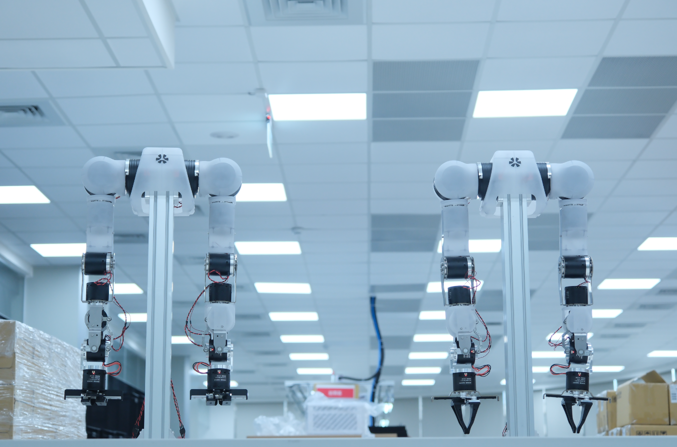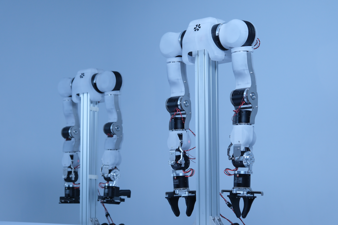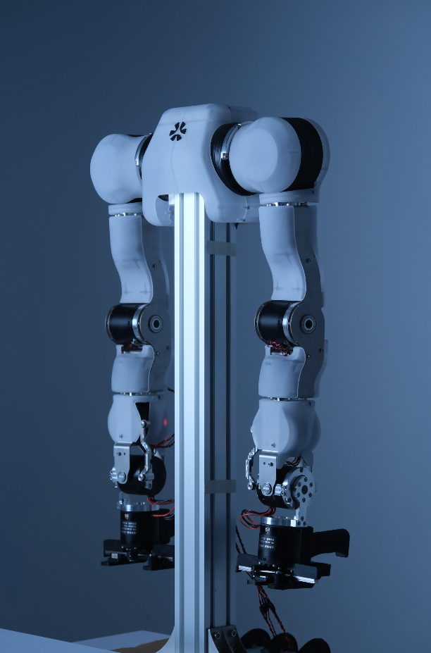 This is a ready to go 2 robot kit designed for puppeteering teleoperation setup. An operator controls the Leader robot which has 2 control handles, the joint positions are forwarded to the Follower robot which has 2 grippers. This creates a low latency method for collecting data and testing out certain bimanual manipulation tasks.